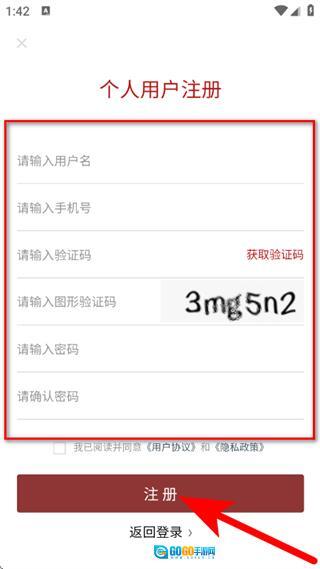先输入用户名,接着输入验证码,然后设置密码并再次确认密码,勾选相关选项后,点击注册按钮即可完成操作。