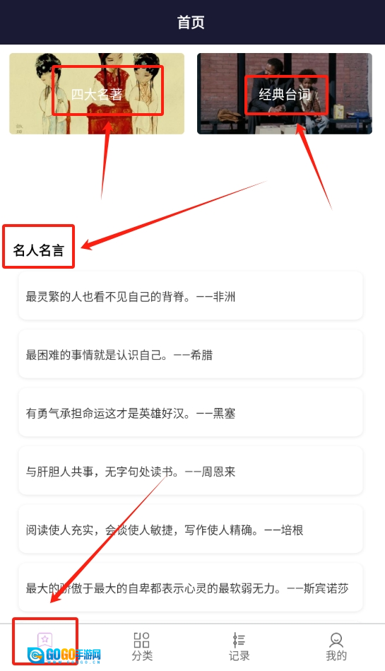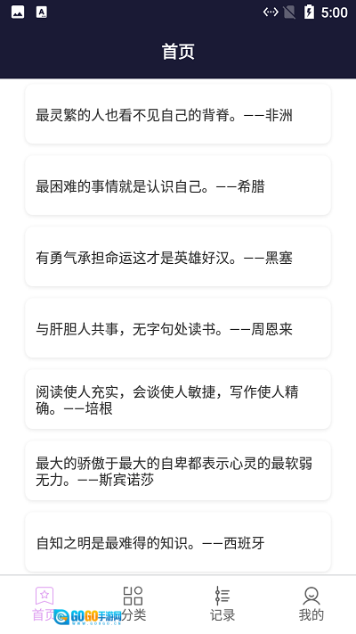 打开软件后,首页会展示各类经典名言,涵盖古今中外,随手浏览一番便能有所收获。