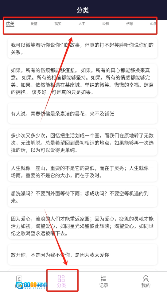 继续向下滑动页面,还能依据爱情、励志等不同分类来查找名言,不管你想用哪种类型的,都能迅速找到。