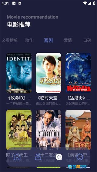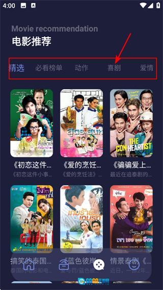 在电影推荐页面,挑选分类标签,浏览喜剧类电影的推荐内容。