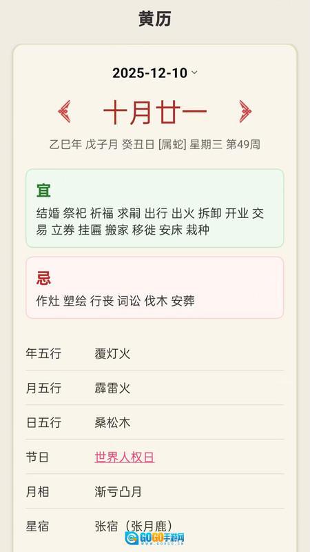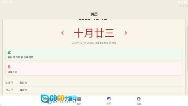 在黄历页面,能看到每一天的宜忌介绍。
