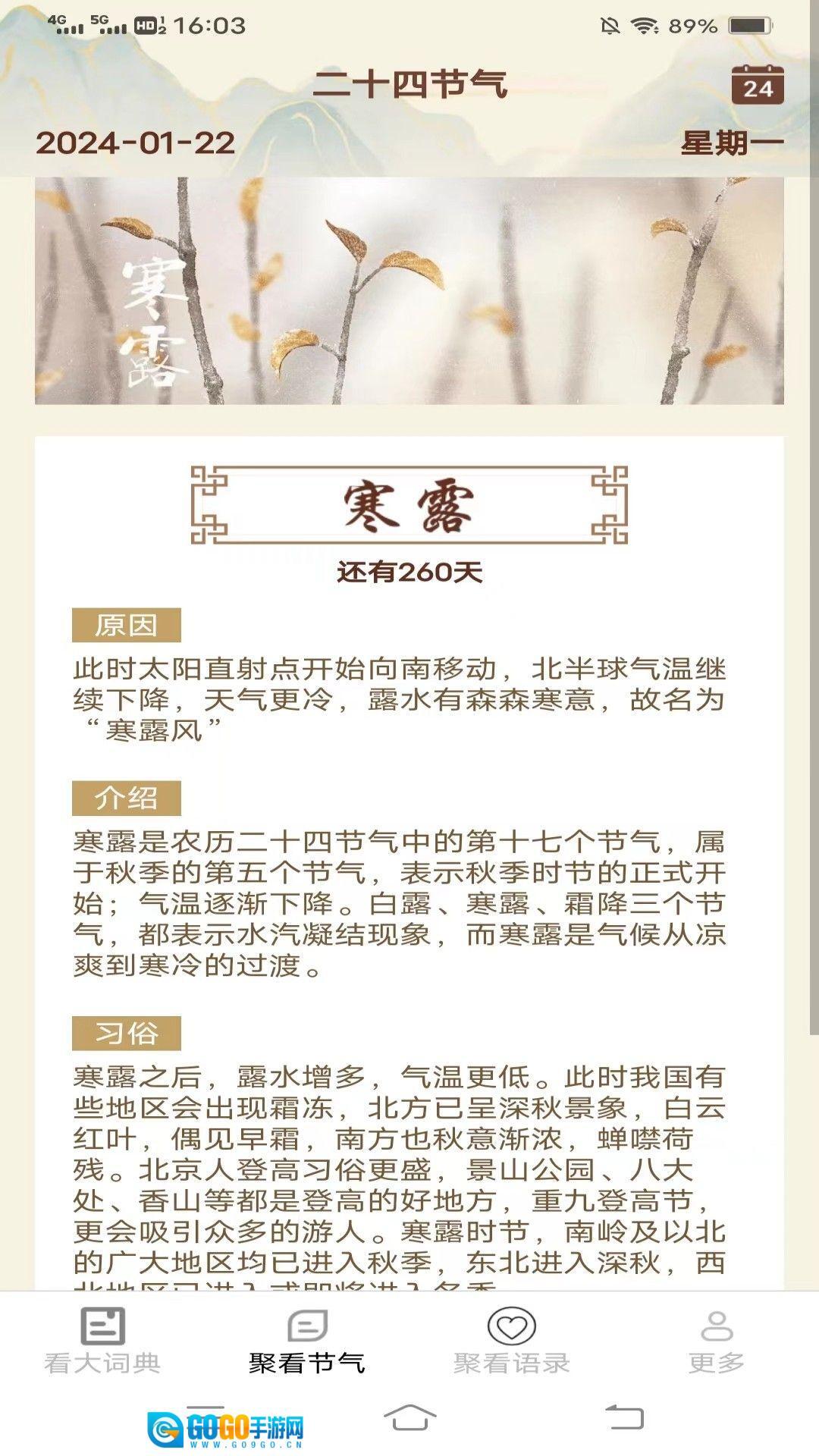 新聚看手机版具备多种实用功能,用户通过平台浏览能有效增长知识。平台的词典功能十分强大,遇到不认识的内容可随时在线查询,系统会提供详细释义;此外,平台还实时更新大量节气信息,方便用户随时在线查看。