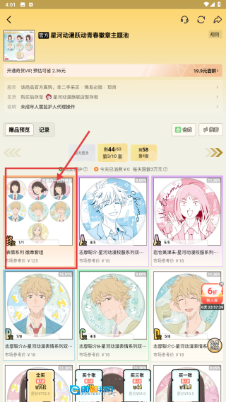 在谷圈商品页面,找到星间动漫联名青春徽章主题池并点击进入该主题池页面。