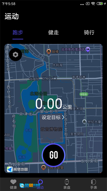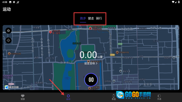 点击底部的运动选项,进入运动页面后,能选择跑步、健走、骑行等不同运动类型,设置好运动目标后点击GO按钮即可开始运动。