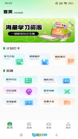 首页的学习资源十分丰富,包含随机词汇学习、数字学习以及记忆训练教学等多种内容。