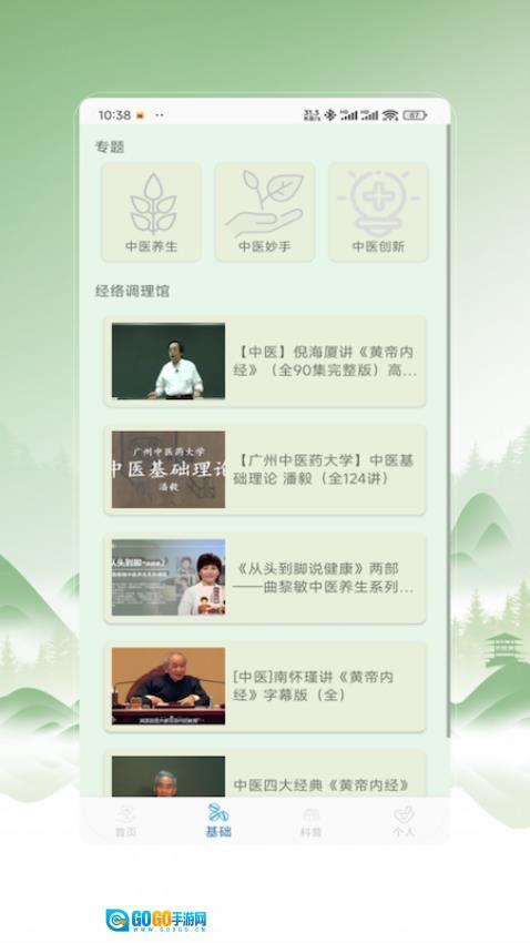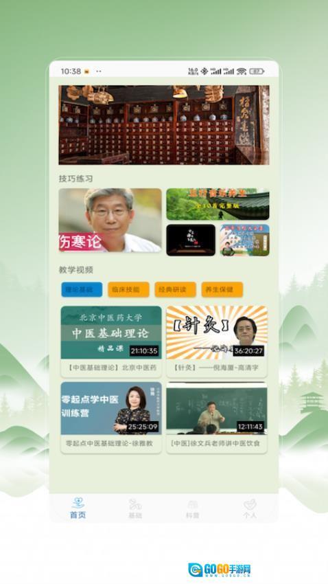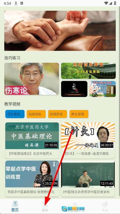 打开,点击底部导航栏的基础选项,进入中医基础学习页面。
