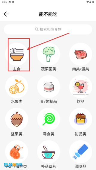 在“能不能吃”页面,选择主食分类,即可查看宠物可食用的主食类型以及相关建议。