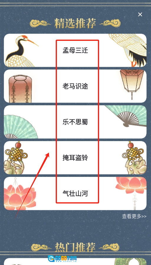 从成语列表中选一个你感兴趣的成语,点击它就能进入详情页面。