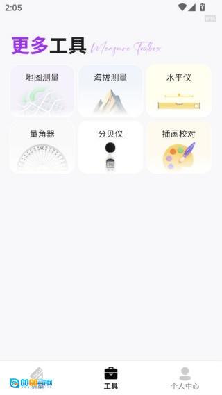 工具选项里包含地图、海拔、水平仪、量角器、分贝仪等测量功能,同时支持插画校对操作。