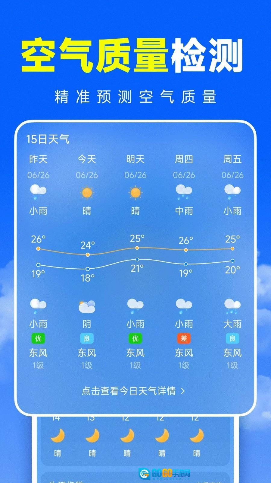 提供多款动态变化的桌面背景,能够根据实时天气与昼夜节律自动切换,点击即可查看详细天气预报。