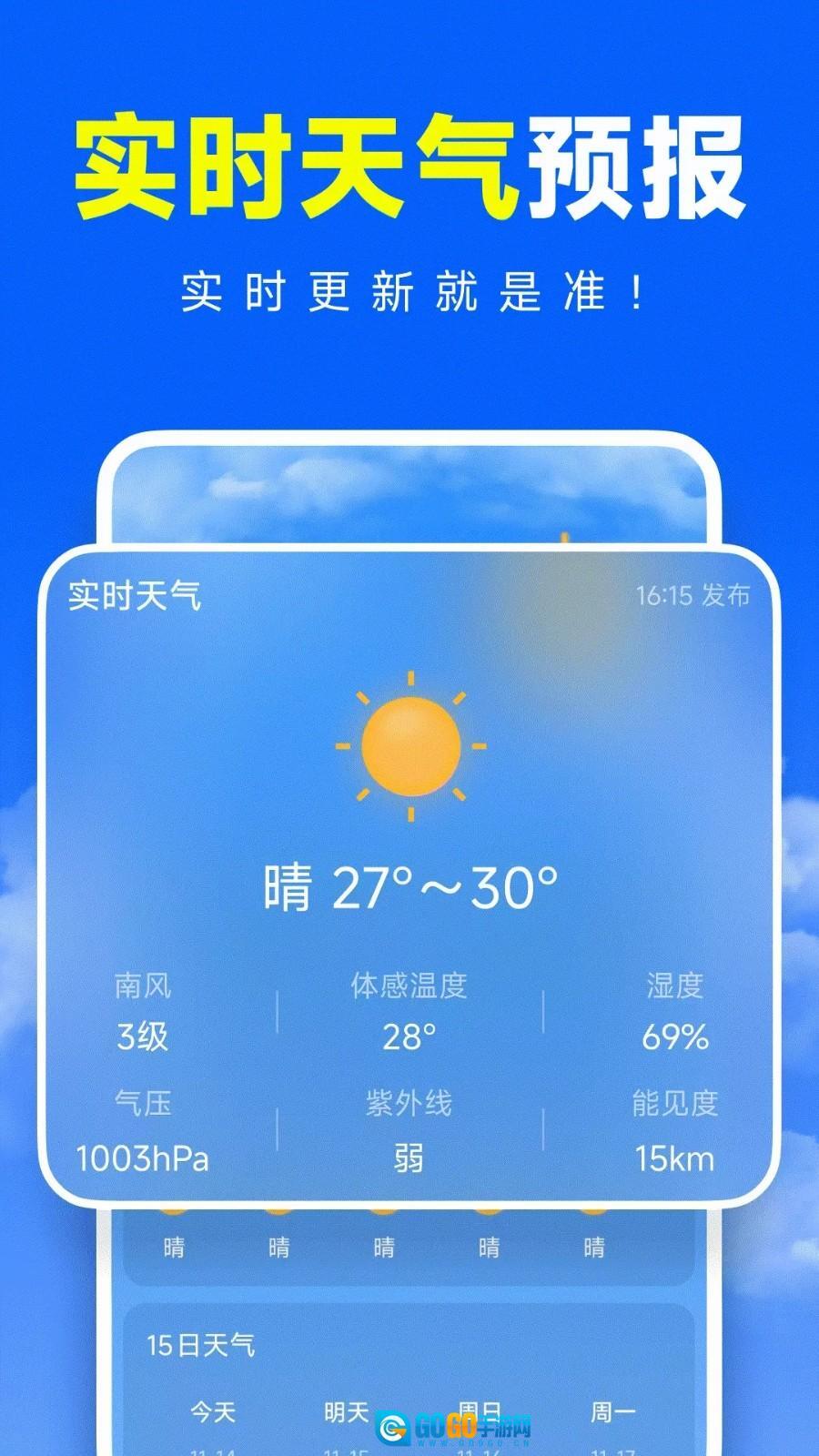 在首页可查看丰富功能,包括最新的天气情况。