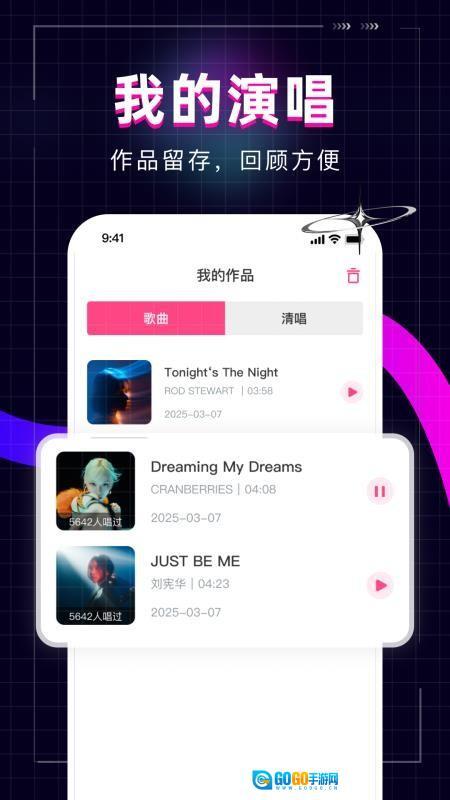 演唱界面设计专业,左滑可切换音效预设,右滑能调整麦克风参数,录制时支持暂停续录、分段录制等功能,便于用户完成复杂歌曲的演唱。