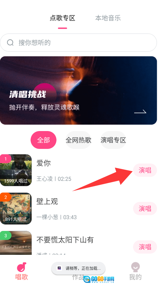 点击红色框框的搜索栏搜索你想听的歌曲。