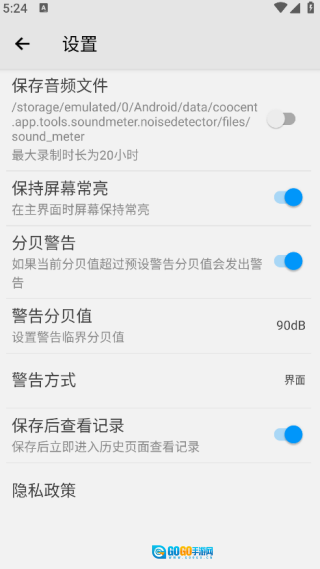 点击“设置”后,就能看到保存音频文件、保持屏幕常亮、分贝警告等功能选项。