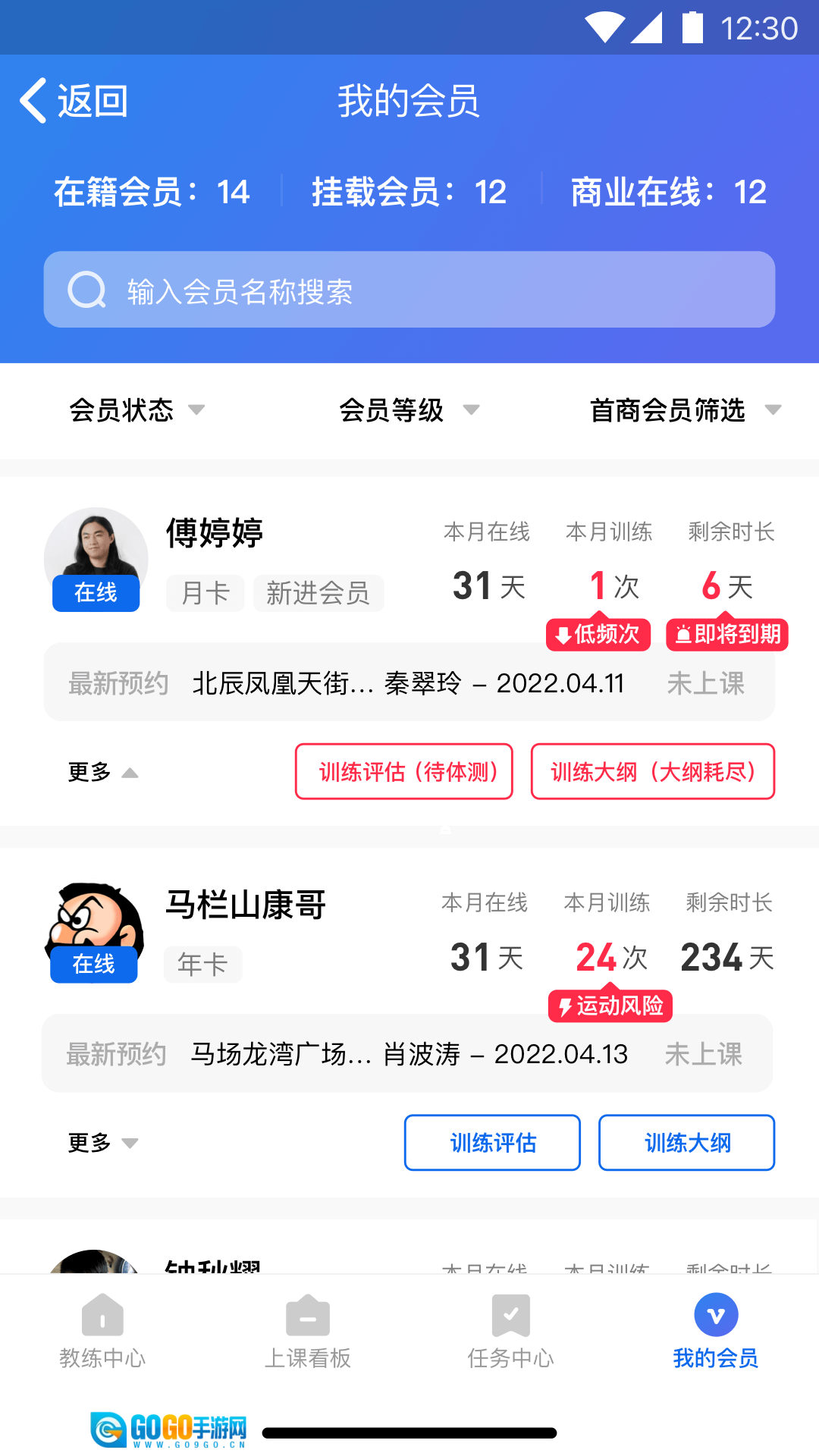 可记录会员的训练评估结果、课程剩余时长以及运动风险等相关信息,并且能够依据会员等级和状态进行筛选。