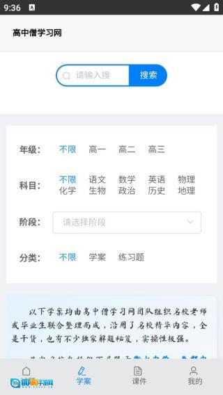 点击学案后,既能够输入关键词进行搜索,也可以通过选择所需的类型来查找。