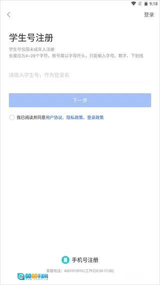 未成年用户可选择“学生号注册”通道,借助学籍信息完成身份认证。