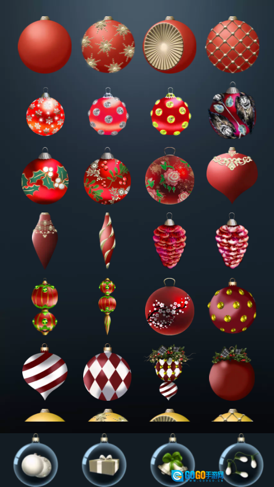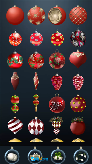 这里提供多种圣诞装饰元素,包括球饰、彩灯、雪花、缎带等,用户可以自由挑选并搭配这些多样的装饰。