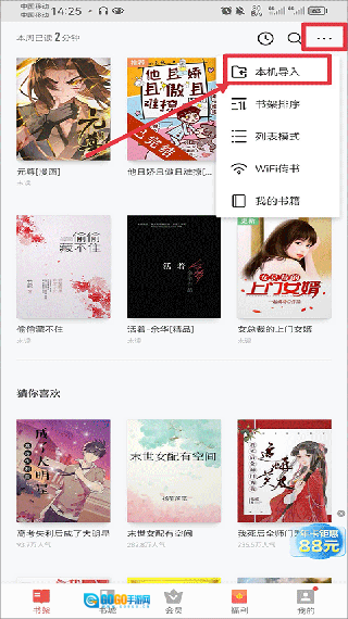 首先打开应用程序,进入书架界面后点击右上角的三点图标,接着选择“本机导入”选项。