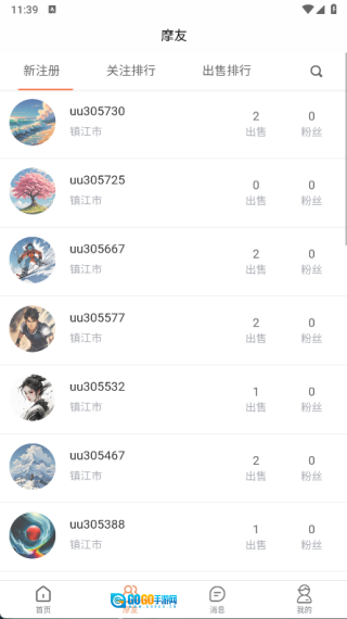 在摩友页面中,用户可以使用新注册、关注排行、出售排行等功能。