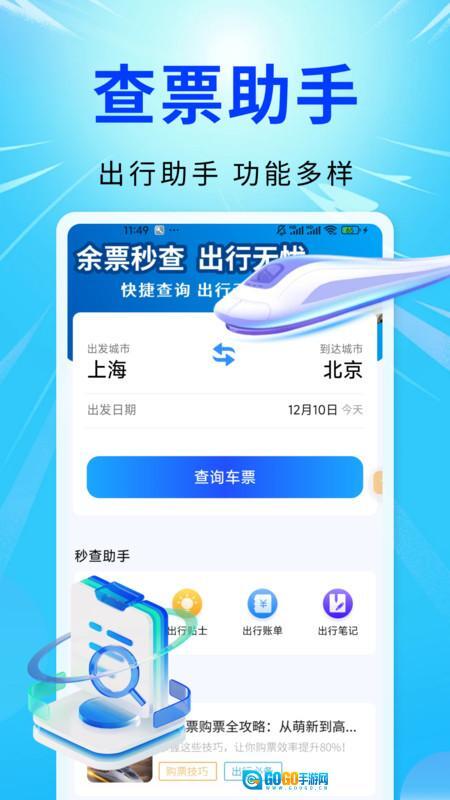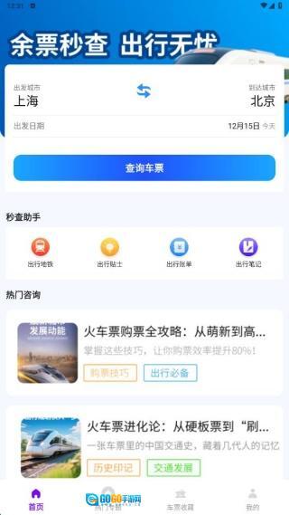首页设有车票查询功能,同时配备了秒查助手与热门咨询服务。