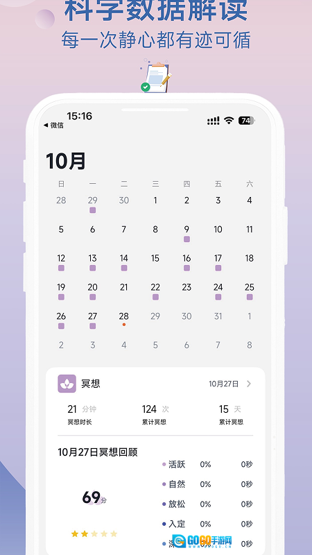 提供清晰日历视图,点击对应日期即可快速查看当日冥想时长、状态等详细信息,方便回顾追踪。