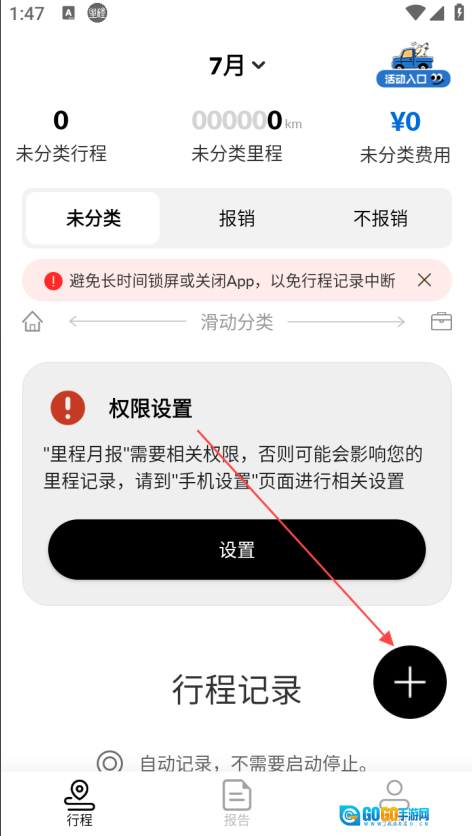 进入【行程】界面,点击右下角【+】图标。