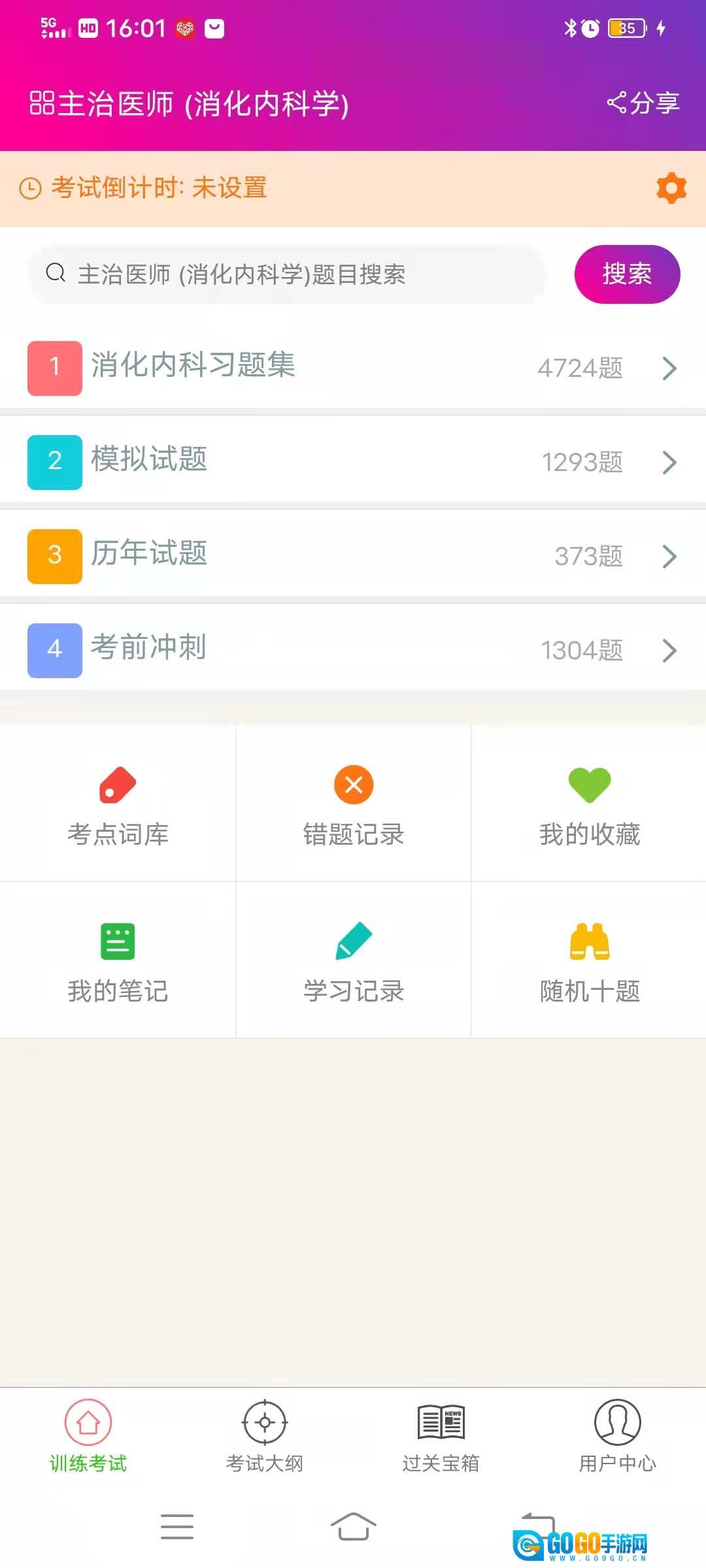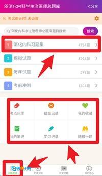 在“训练考试”页面,用户能够进入消化内科习题集、模拟试题、历年真题以及考前冲刺板块,同时还可以使用考点词库、错题记录、学习记录等相关功能。