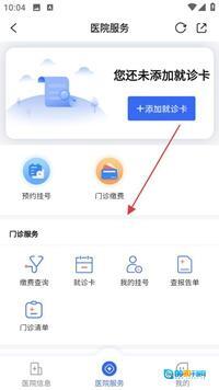 在医院服务页面中,用户能够添加就诊卡,同时还能使用预约挂号、门诊缴费等各类门诊服务功能,其中包括缴费查询、我的挂号等具体功能。