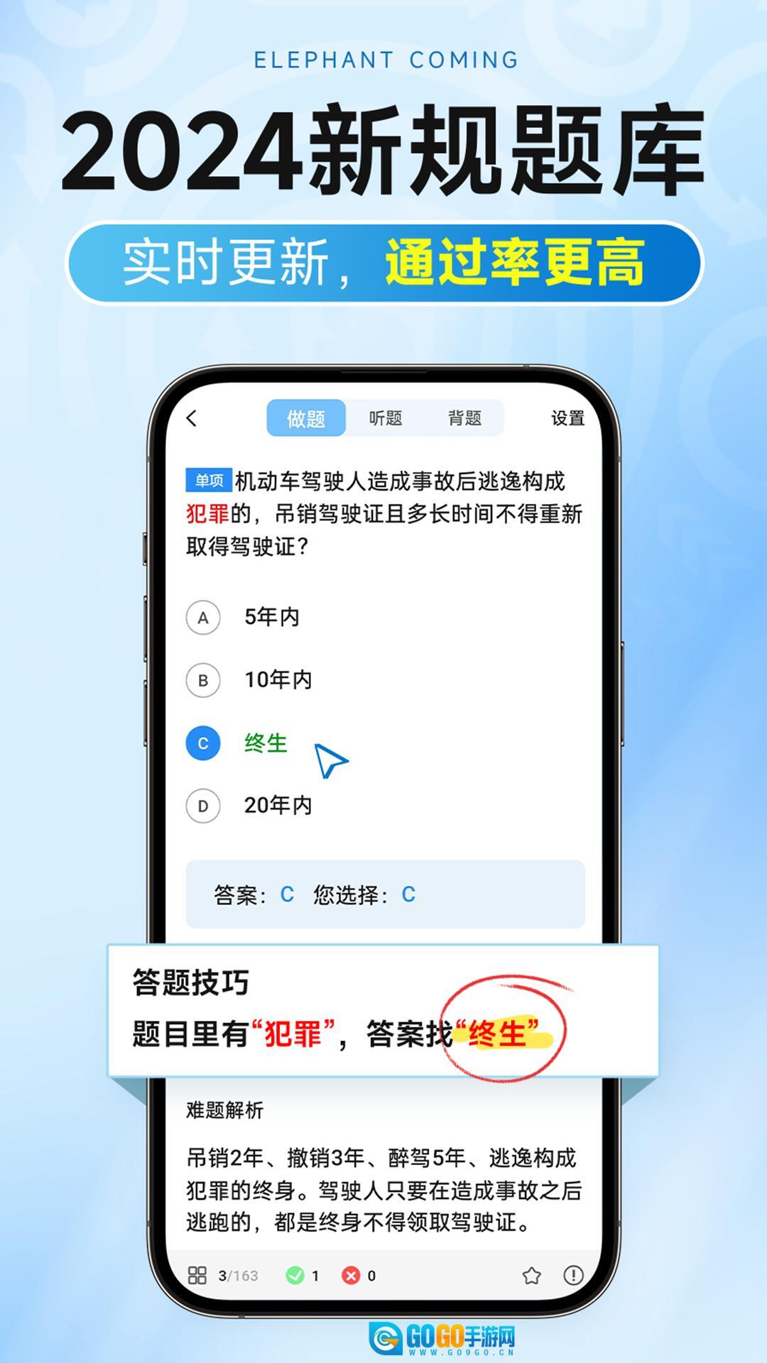 大象驾到Pro是一款专业的驾考学习软件,专为各类机动车驾驶资格考生打造,汇聚了丰富的驾考题库资源,涵盖小型汽车、摩托车、货运车辆等多种准驾车型的理论考试内容。用户能够依据自身学习需求,有针对性地挑选不同知识模块开展专项训练,感兴趣的用户赶快体验吧。