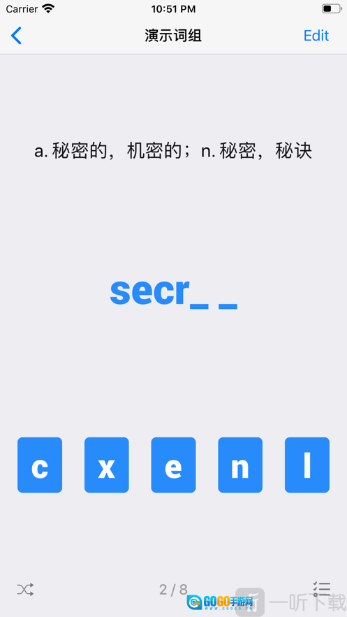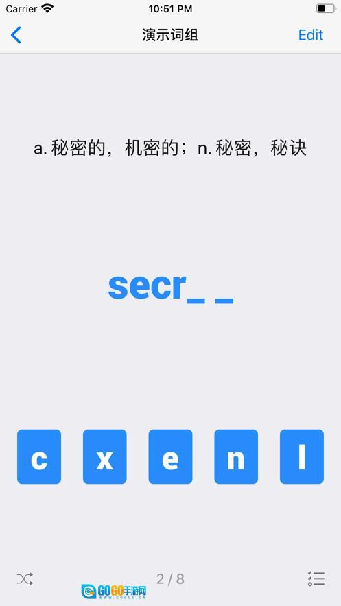 2. 从五张卡片中挑选出正确的字母,拼成完整单词,并且也支持通过键盘进行输入。