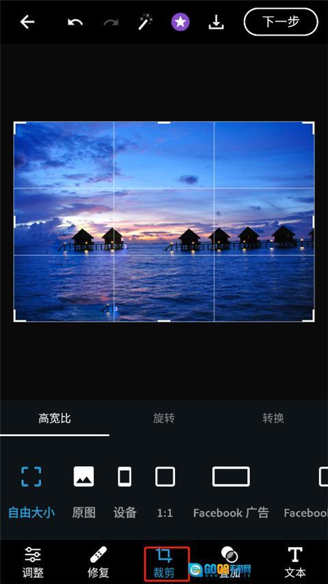 9、点击第4个剪裁图标,用户能够对照片进行裁切、修齐、旋转以及翻转操作。借助该功能,用户可依据任意社交媒体平台的要求,选择照片的宽高比,或者自定义照片尺寸。