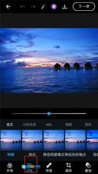 6、点击第二个图标,便能对图片执行锐化、降噪,或是模糊、晕影、HSL、色调分割等操作,还能够手动调节曝光、对比度等参数。左右滑动箭头所指向的第二个选项框,就能够调节更多参数。