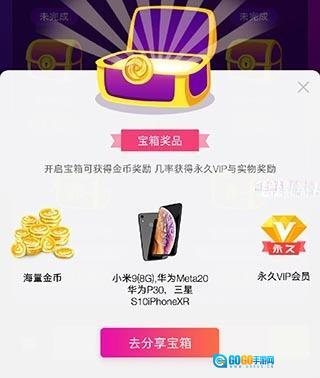 轻点“做任务开宝箱”,即有机会赢取海量金币,还有可能收获小米手机、华为手机、苹果手机或永久会员等惊喜好礼。