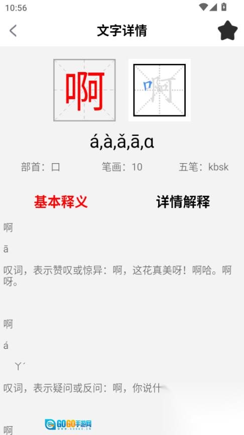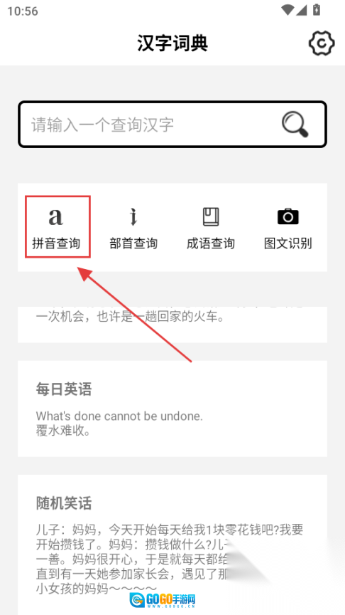 想要了解的汉字,就能查看其部首、笔画、解析、造句等内容。
