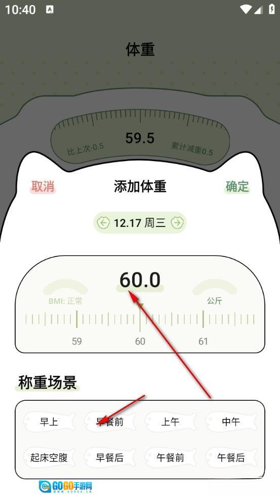 滑动选择体重指数,再选择下方称重场景