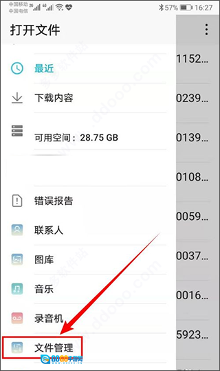 8、当“打开文件”的侧边栏弹出后,点击选择其中的【文件管理】选项。