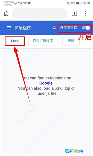5、进入打开的页面后,先开启【开发者模式】,再点击【Load】按钮。