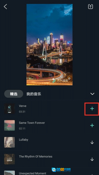 3、然后会弹出海量的音乐,选中我的音乐,就能够看见在自己本地中的音乐文件,也可以选择软件中带有音效,后在点击“+”号就能够添加。