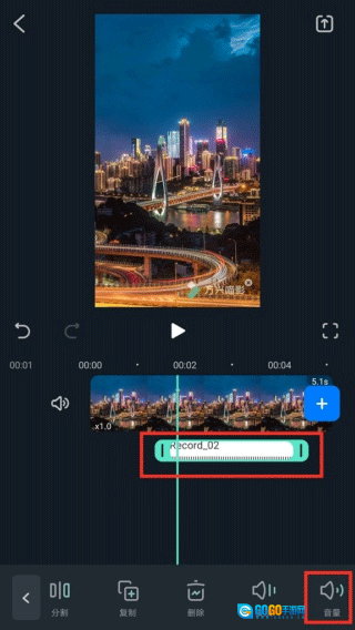 4、选中视频下方音频,用户可以在音频上进行分割,控制音频在视频出现的时间和结束的时间,在右下方音量图标,控制音频在视频中的声音大小,还有淡入淡出的音频效果可供选择。