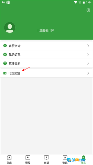 1、打开软件进入首页,选择下方菜单栏【我的】模块,点击上方的“代理加盟”。