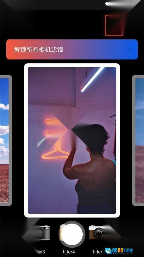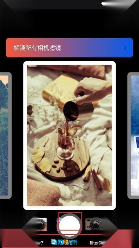 1、进入软件,它为用户提供了海量的胶卷滤镜,你只需选择自己喜欢的滤镜,点击中间的拍照键即可;