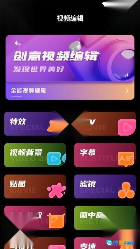 5、点击视频编辑,里面提供了视频背景、特效、字幕、MV、视频截取、马赛克、画中画、变速等等功能。