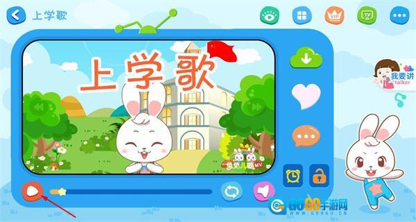 2、在上学歌播放界面,点击左下角播放按钮,可开始播放该儿歌,界面展示儿歌画面和操作控件。