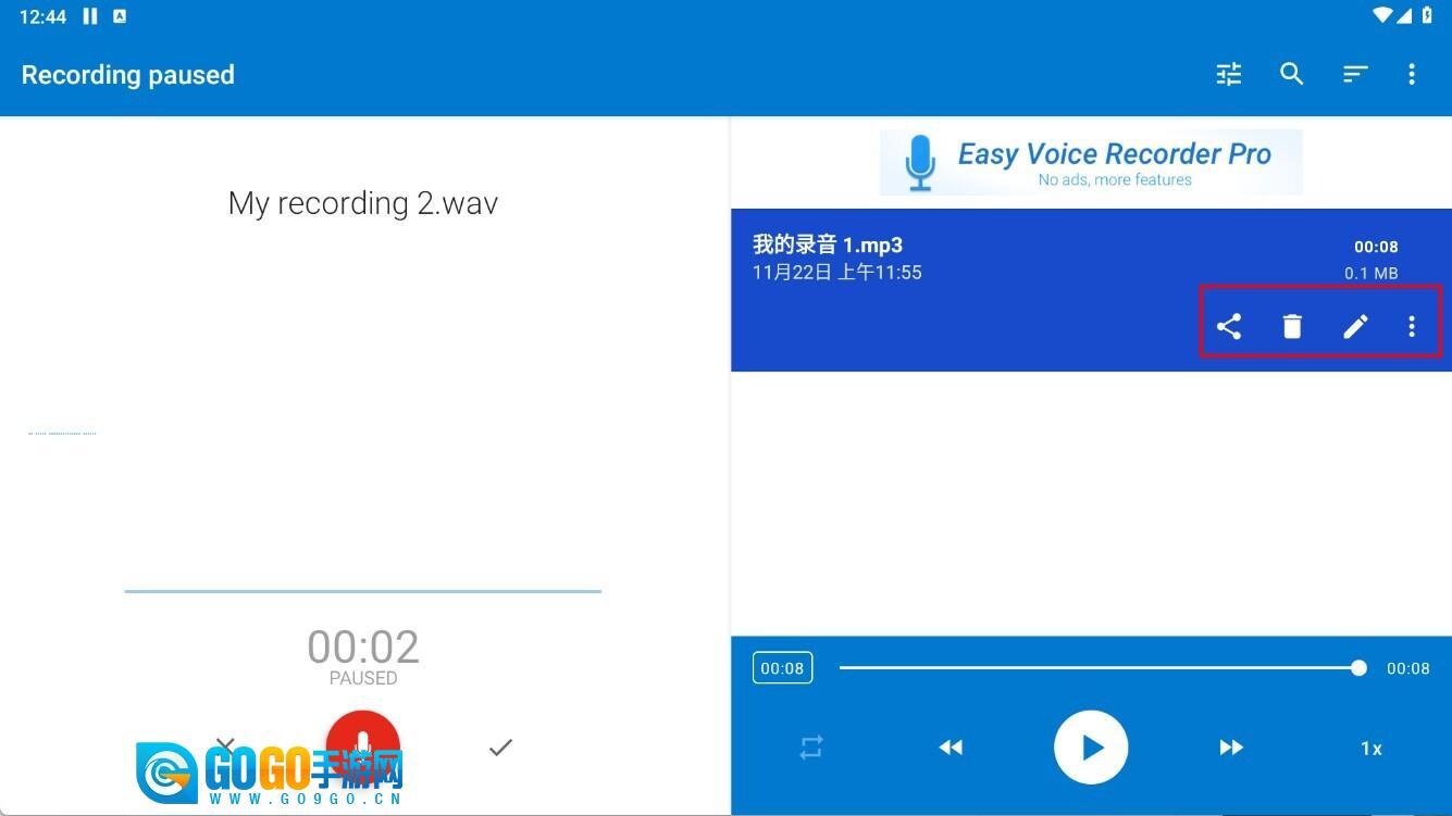 4、选中【我的录音1.mp3】,使用右侧【分享】-【删除】-【编辑】快捷图标,快速完成操作提升效率。