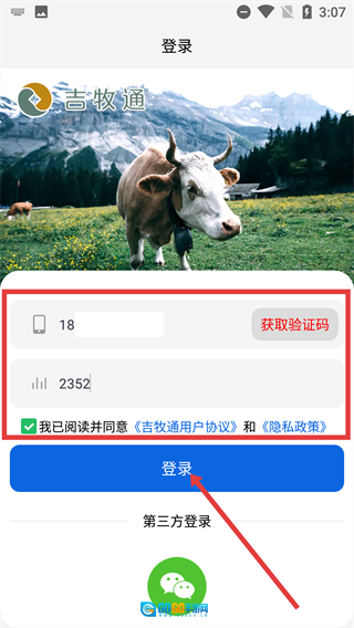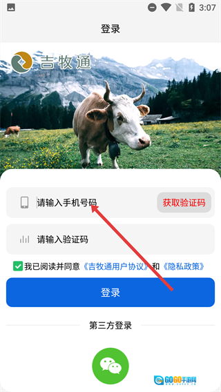1、打开吉牧通的登录界面,点击【请输入手机号码】的输入框,并且勾选【我已阅读并同意《吉牧通用户协议》和《隐私政策》】这一选项。