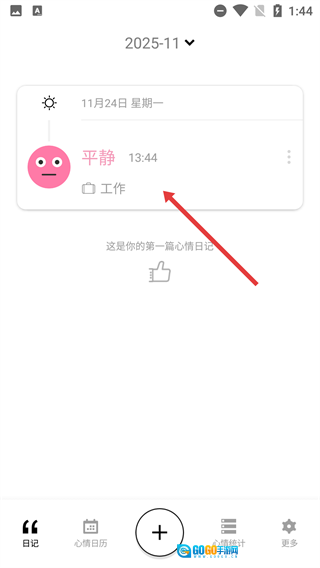 4、保存完成后,在日记页面能够查看已记录的心情日记,例如【平静-工作】这类记录。
