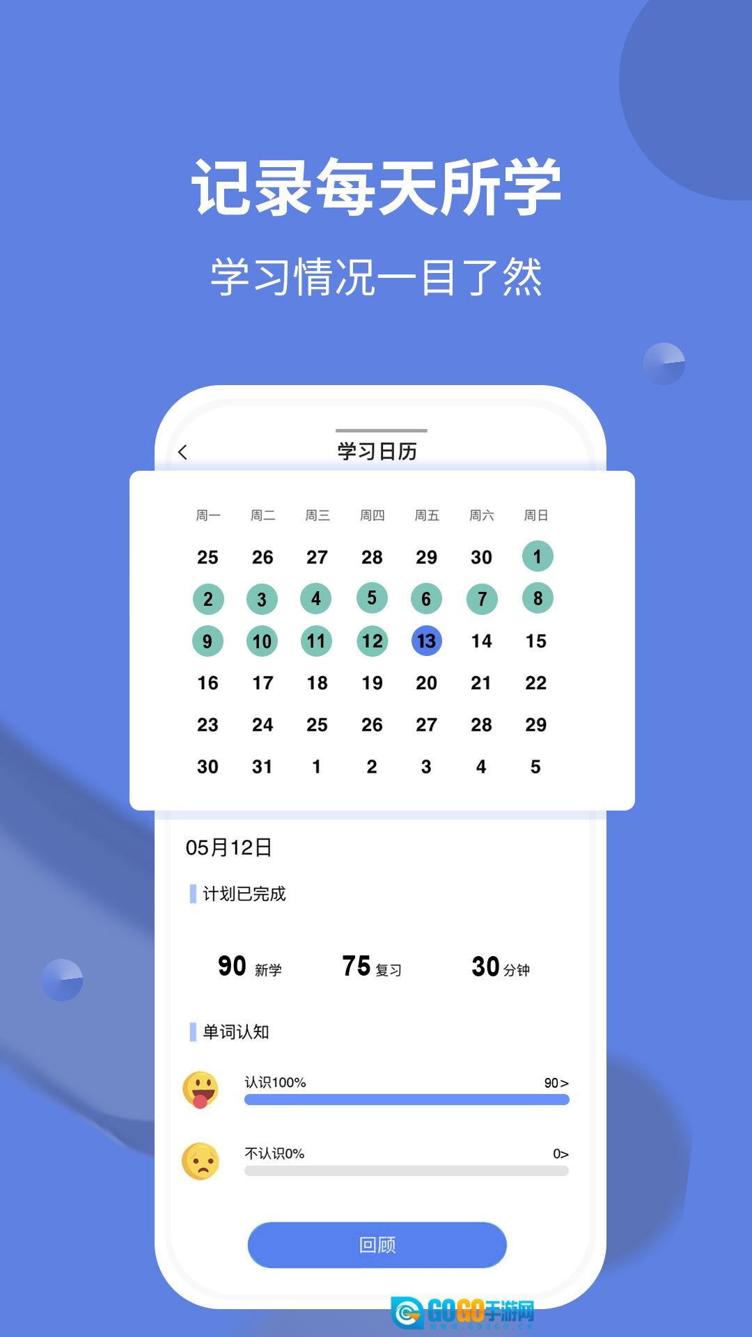 全方位掌握单词,可提供听、说、拼写练习,记录每日学习单词的内容,查看学习日历十分直观。