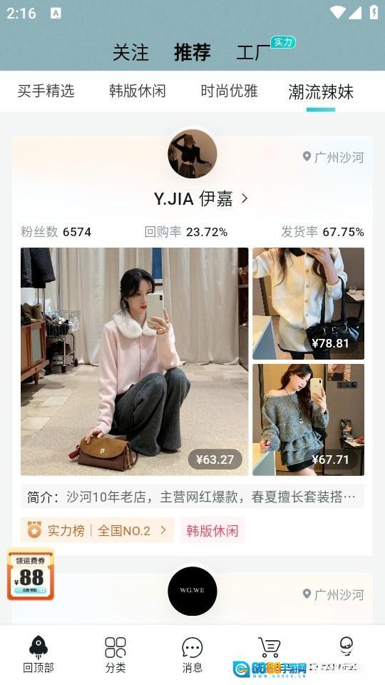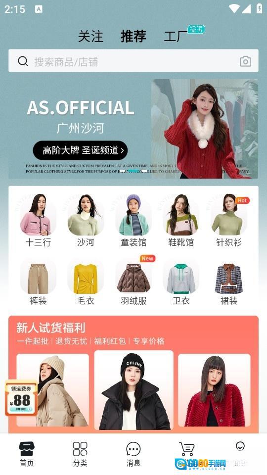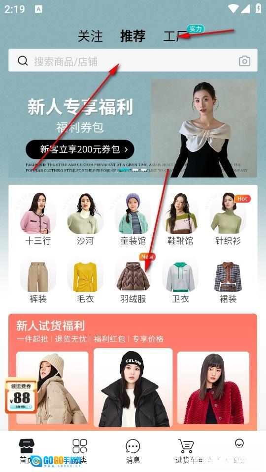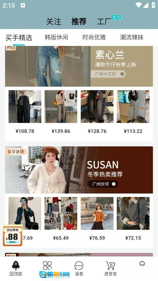点击软件进入首页后,我们既能在顶部选择相关推荐,也可以直接寻找源头工厂拿货;既能够搜索自己心仪的品牌衣物,还能在推荐中找到所需的衣服品类。