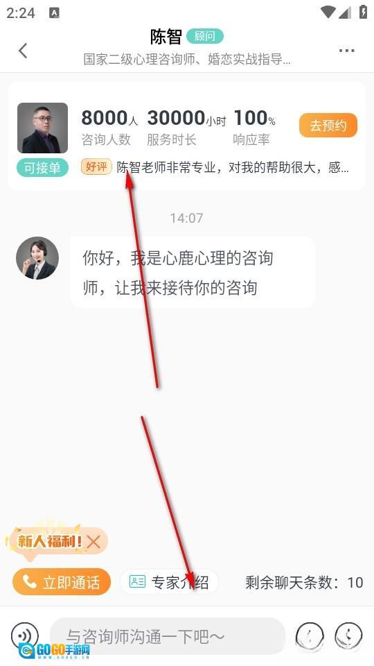 我们点击进入聊天界面后,既能在界面内咨询相关问题,也能在下方查看相关专家介绍,还可以选择视频或文字的咨询方式。